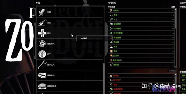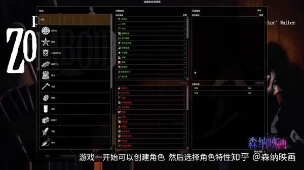 游戏一开始可以创建角色,然后选择角色特性,上面的是它的一些跑的快,负重多,攻击力强,不易生病等正面特性。